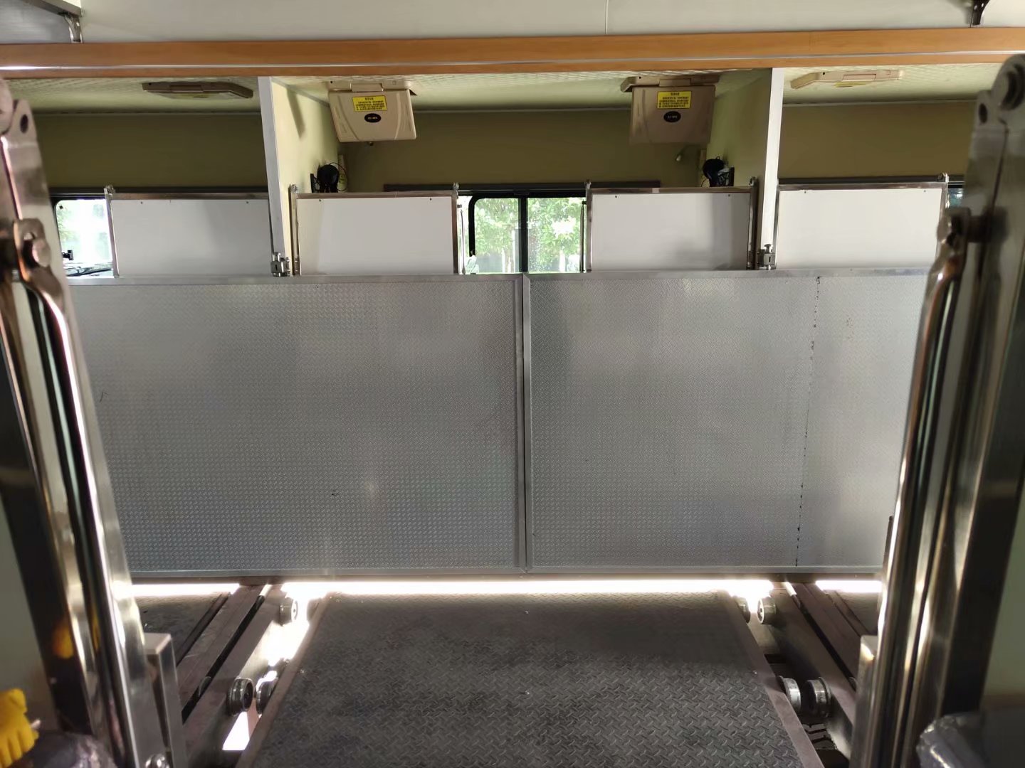 乘、住区在中部扩展位,中间固定床设置在主厢体上,折叠床在左、右厢体上;左、右厢体前部各挂19寸车载液晶电视一台,每个床铺都配有耳机,充电插座。